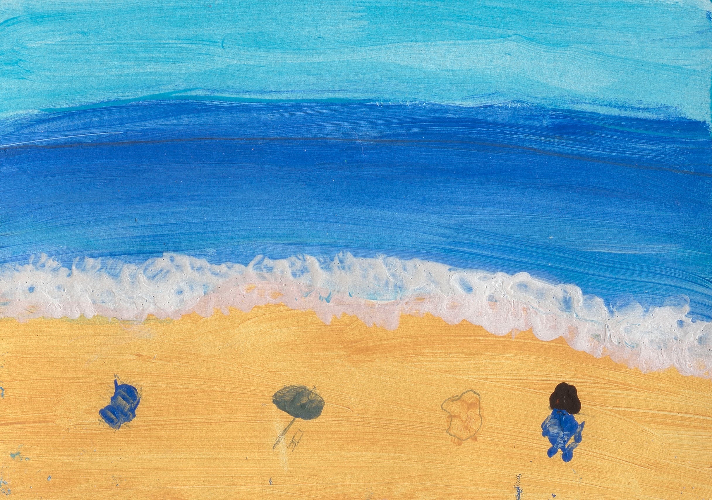 This artwork by Cooper Stelino is a serene celebration of summer’s simplicity and joy. The piece captures a tranquil beach scene, where the golden sands meet the gentle, foamy embrace of the ocean. The vibrant blue of the sea stretches infinitely, merging seamlessly with the sky in a harmony that evokes both peace and freedom. Tiny figures, perhaps sunbathers or dreamers lost in their thoughts, dot the shoreline, bringing a sense of human connection to this natural paradise.
