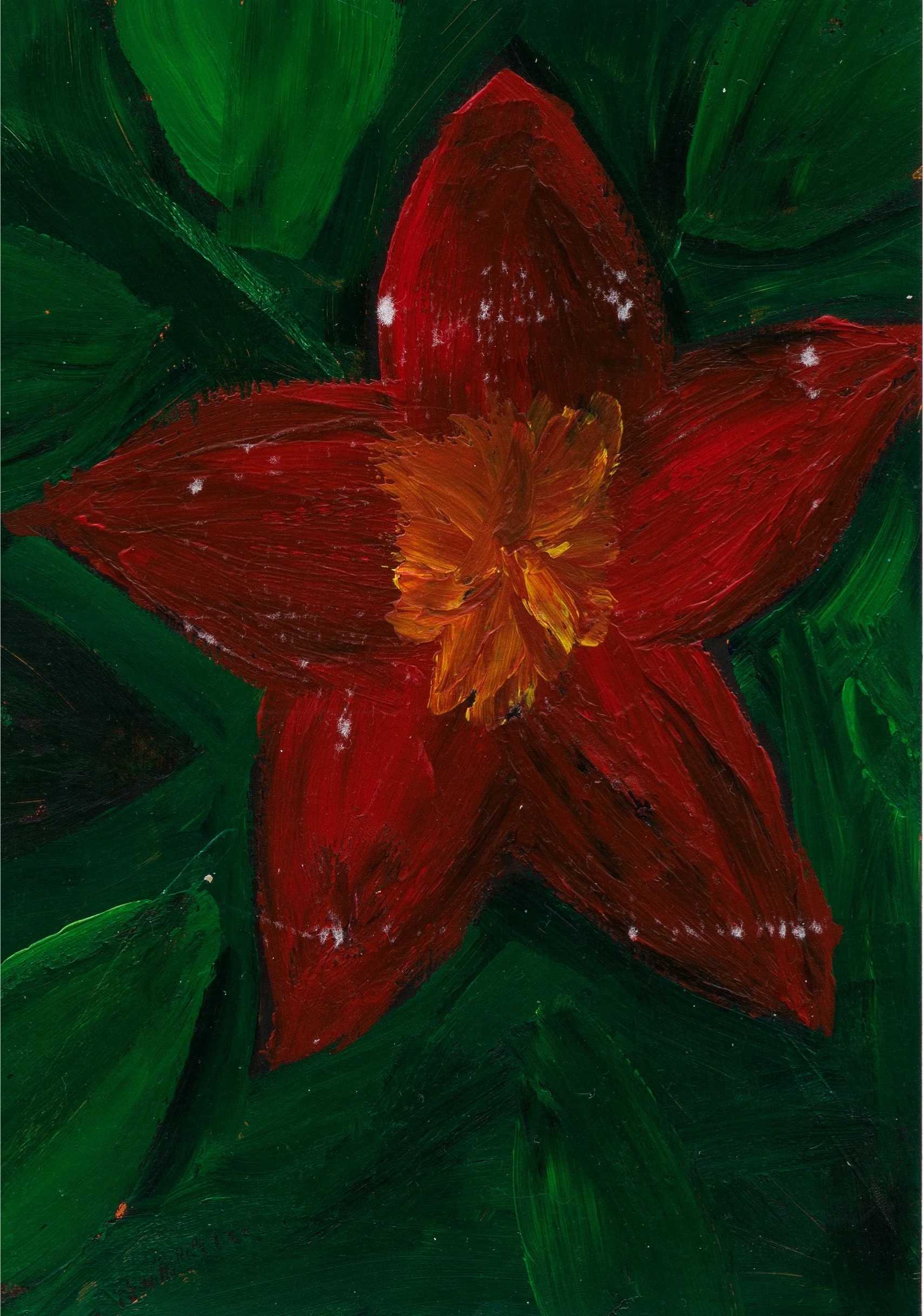 The painting captures a dark, intimate close-up of a 5-petal red flower, its delicate beauty illuminated against the shadowy backdrop of deep green leaves. The deep, crimson hues radiate passion and vitality, drawing immediate attention to the bloom as the focal point of the artwork.