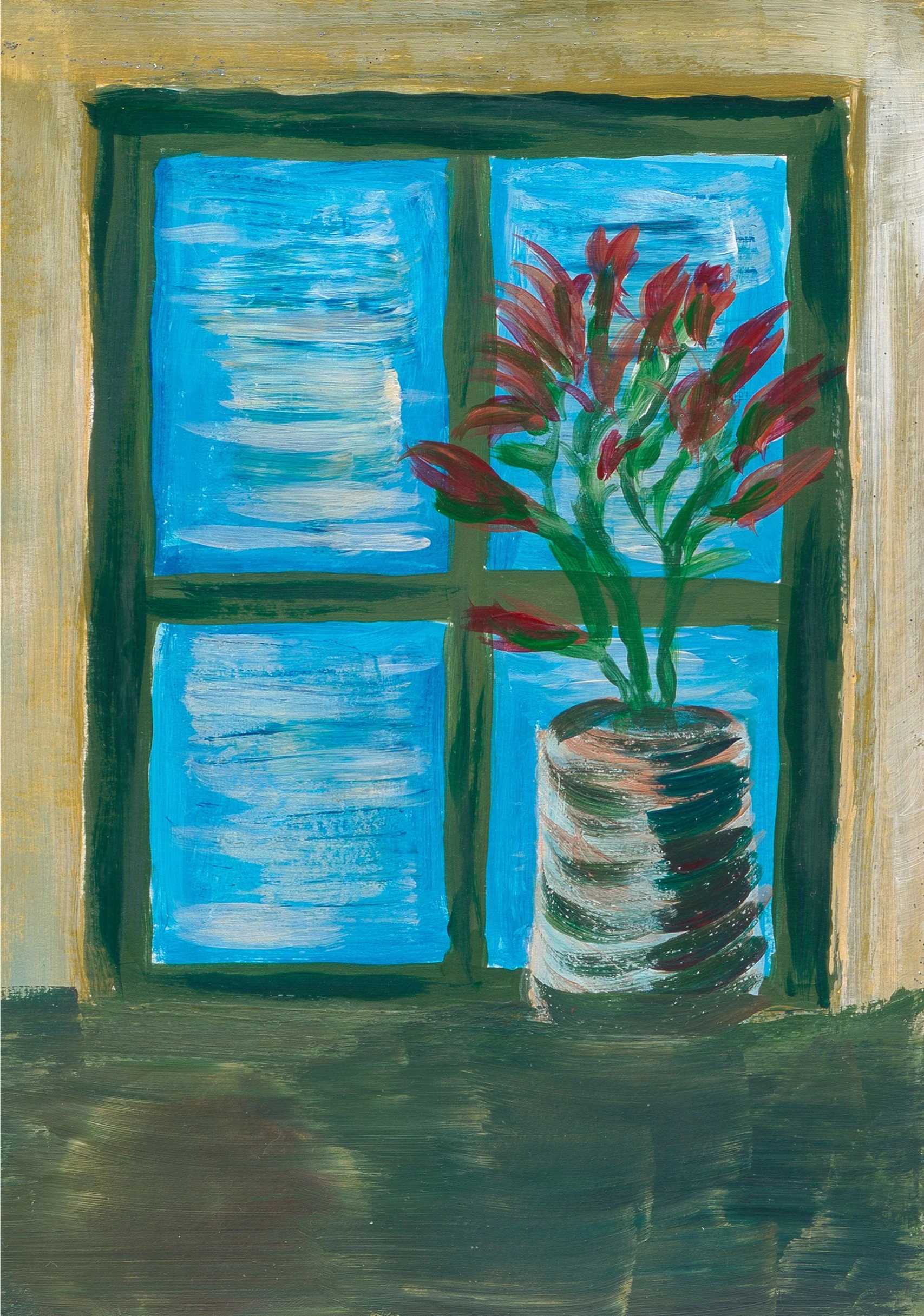 This charming painting captures the vibrant beauty of red flowers in full bloom, delicately arranged against a green window sill. The rich red petals exude vitality, while the green sill adds a refreshing contrast, evoking the tranquillity of nature. The interplay of colours creates a serene yet lively atmosphere, as though inviting the viewer to gaze out through the window and into a world of beauty and calm. This piece radiates warmth and the simple joys of everyday life.