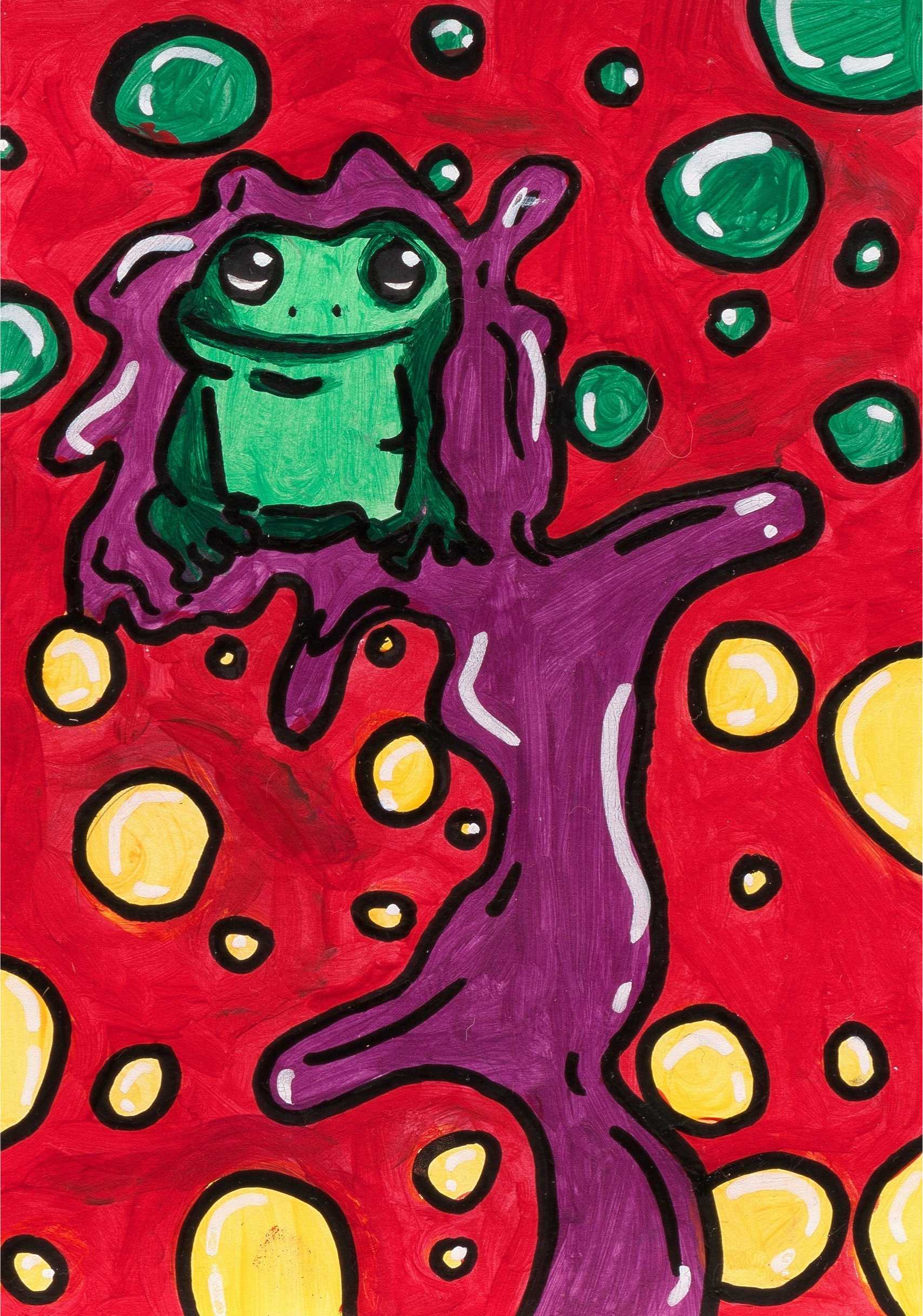 This delightful painting showcases a cheerful cartoon frog, bursting with personality. With its big, round eyes, a wide, mischievous grin, and vibrant green hue, the frog exudes a playful charm. Its expressive features are accentuated with bold outlines, and whimsical details like a jaunty pose or perhaps a tiny accessory, such as a hat or a lily pad, add to its character. This piece radiates lighthearted fun, perfect for evoking smiles and brightening any space.