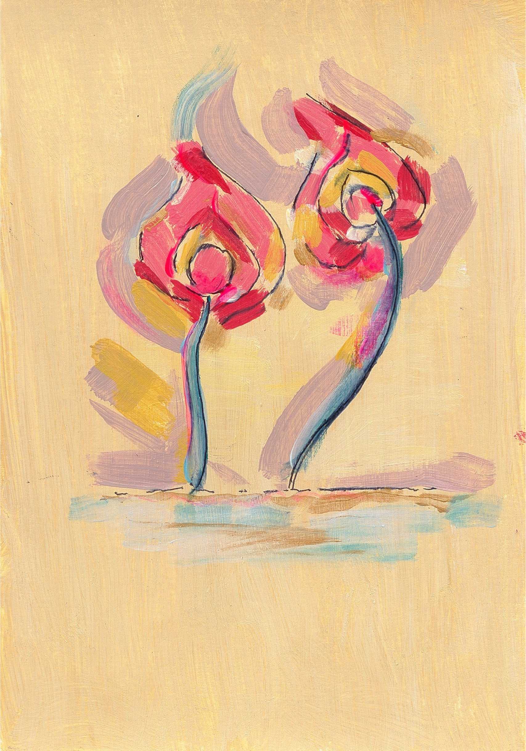 The background, a blend of muted tones and negative space, enhances the boldness of the colours, allowing the flowers to radiate off the canvas. The overall effect is one of joy and movement, a celebration of nature's beauty and the artist's imagination.