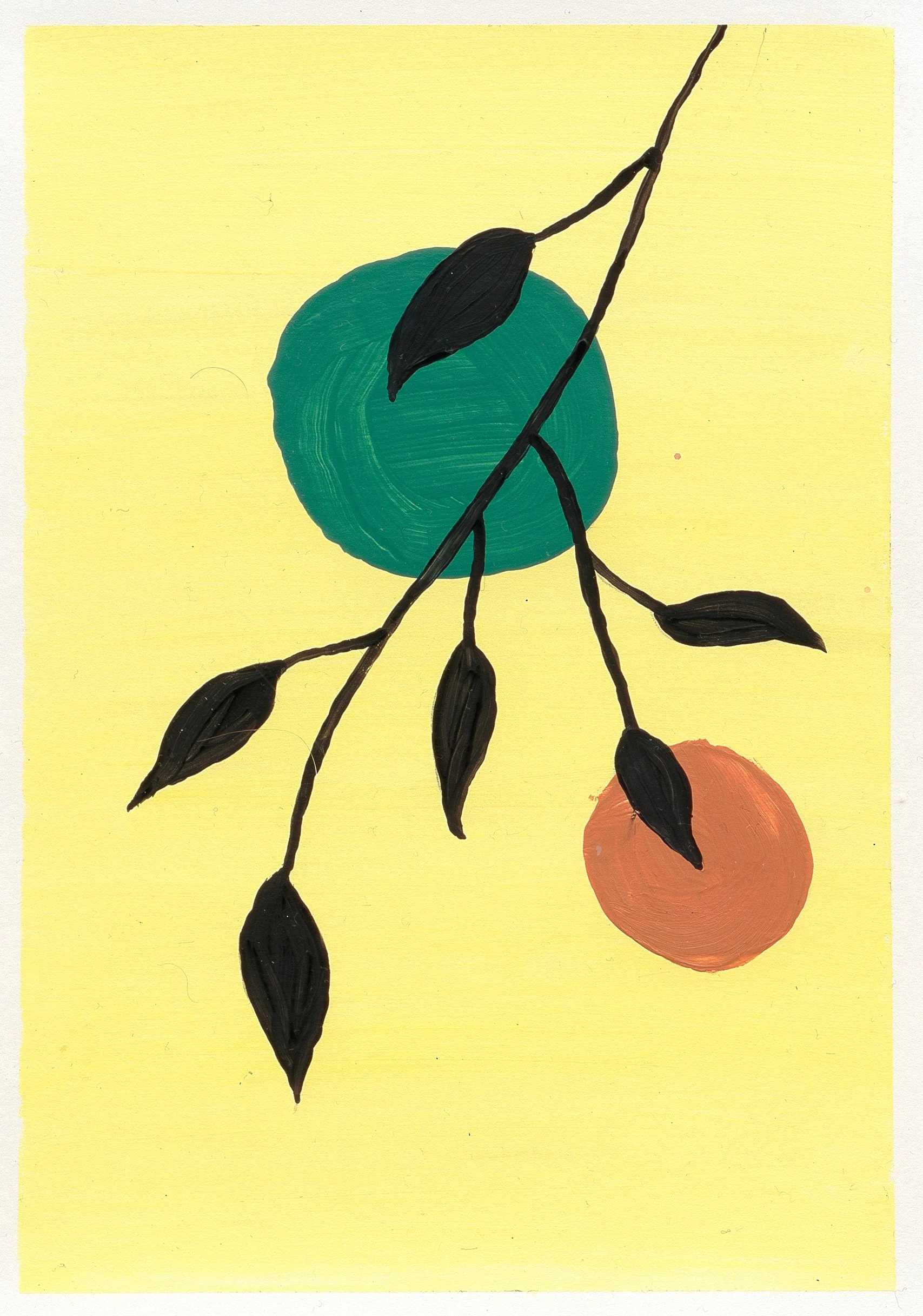 The painting features a yellow canvas as its base, radiating warmth and energy. Against this bold backdrop, striking black leaves spread across the composition, their shapes adding contrast and depth. The leaves' silhouettes are stark and dramatic, creating a sense of movement and rhythm, as though swaying in an unseen breeze.