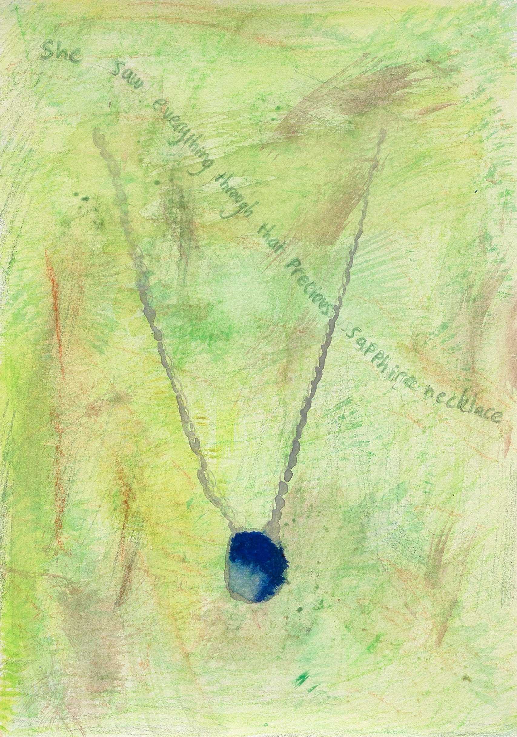 The painting depicts a blurry, almost dreamlike image of a blue sapphire necklace, set against a soft, bluish-green backdrop. The necklace's delicate chain is barely discernible, with its edges fading into the surrounding haze, allowing the striking blue sapphires to emerge as the central focus of the composition. The sapphires shimmer with varying shades of deep blue and lighter, almost ethereal glints, creating a sense of opulence and mystery.