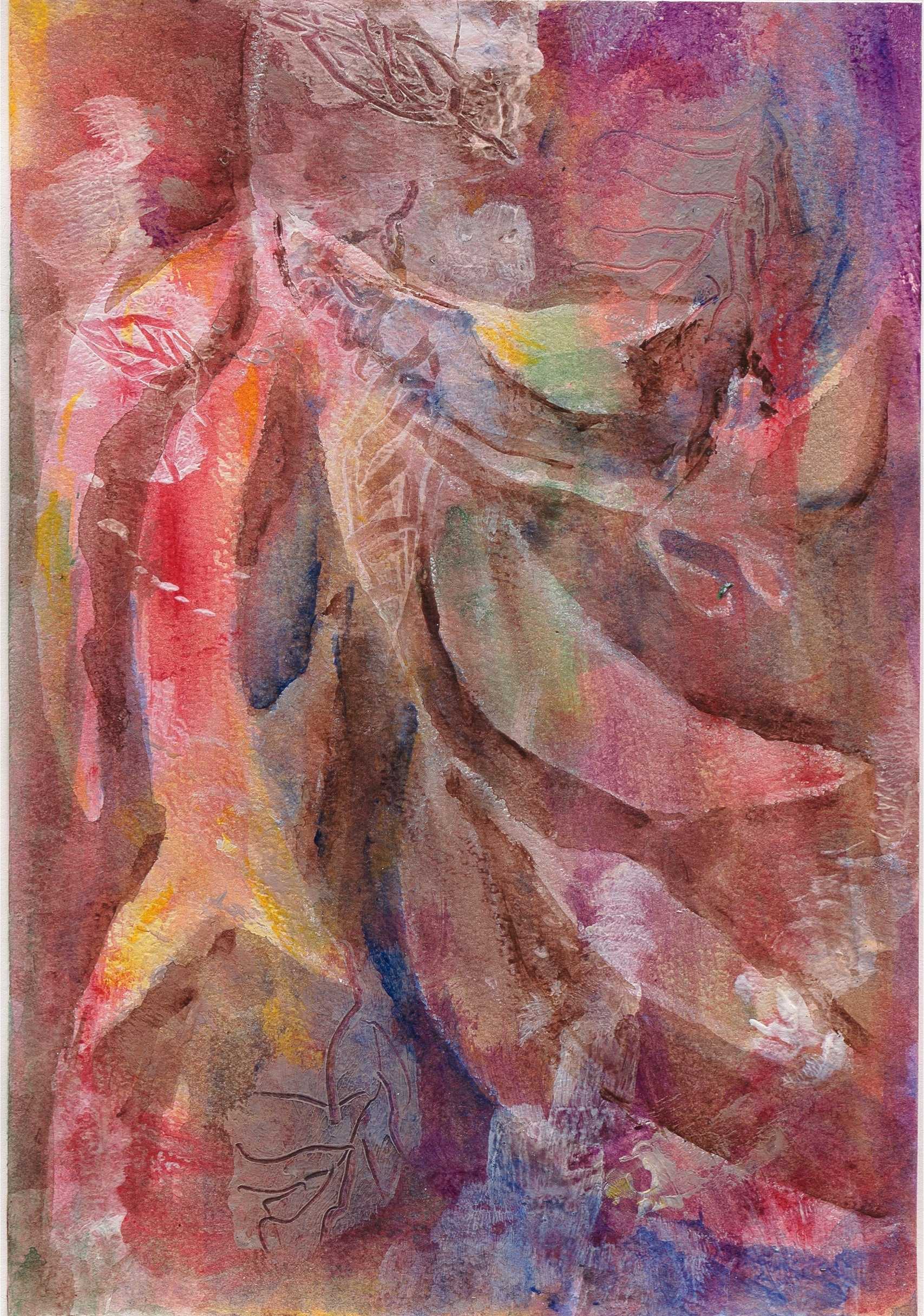 The abstract sundown, created with acrylic paint on a card, presents a bold and expressive interpretation of the setting sun. The composition is filled with sweeping, vibrant strokes that blend warm and cool hues in dynamic ways. Rich oranges, fiery reds, and soft pinks dominate the top portion of the piece, reflecting the intensity of the sun as it dips below the horizon. These colors merge fluidly with streaks of golden yellows and purple tones as they descend toward the center, mimicking the transition from day to night.