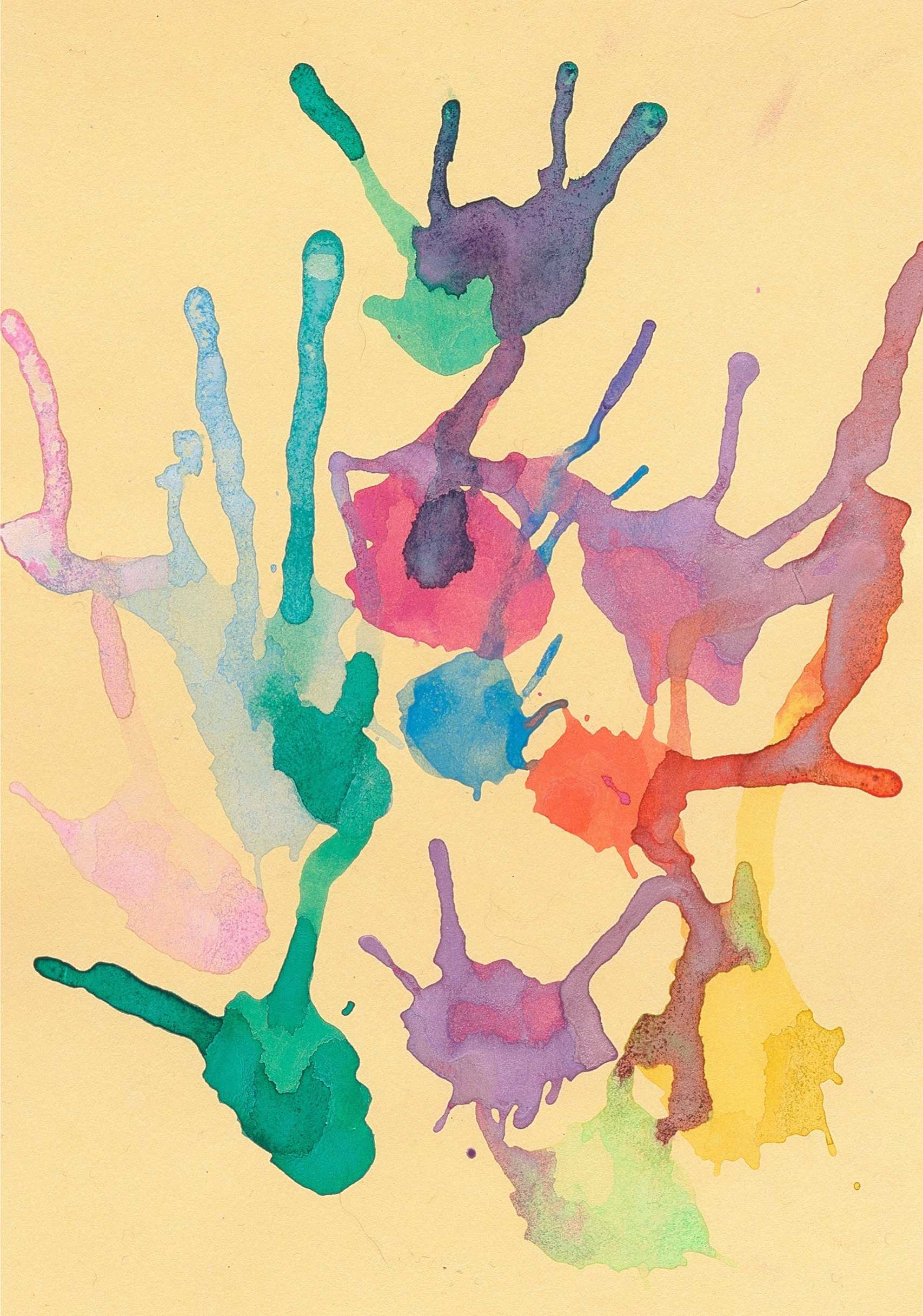Small dots, drips, and trails of paint extend from the main splashes, suggesting energy and spontaneity. The overall effect is lively and expressive, with a feeling of freedom and creativity, making the artwork a celebration of color and form in its simplest, most organic state.