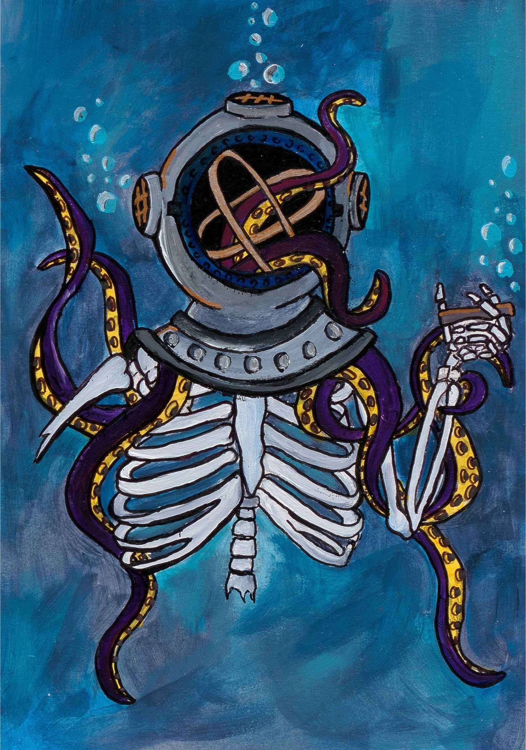 At the center of its body, an exposed rib cage is intricately painted in stark contrast to the softness of the octopus’s form. The ribs are rendered in bone-white tones with delicate shading, giving them a three-dimensional appearance, as if they are a window to its inner essence. This fusion of anatomy and marine life feels otherworldly, evoking a sense of vulnerability and introspection.